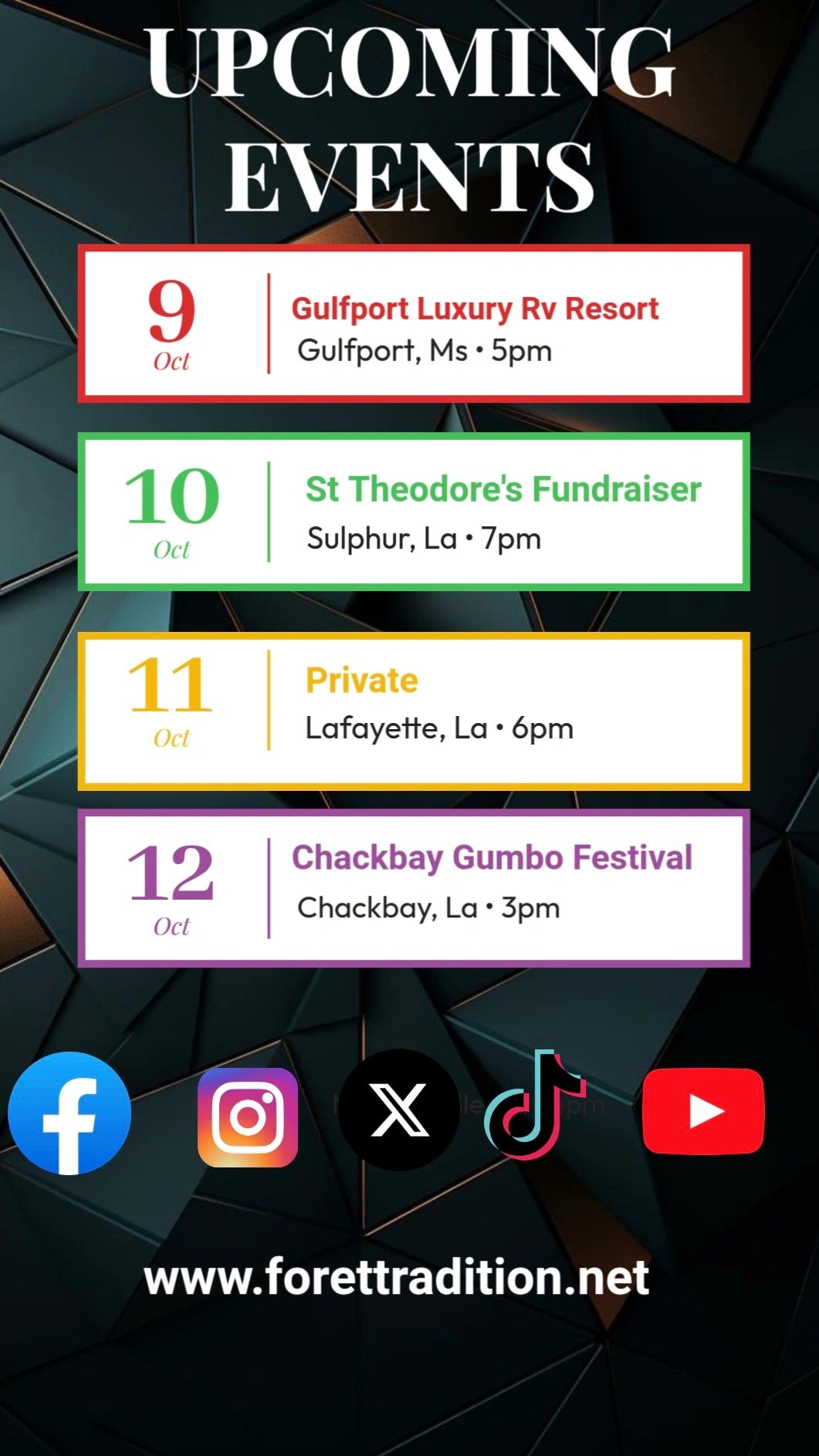 When Ryan turned 18, he took over day to day operations of Foret Tradition. The now Established business that the entire Foret Family had worked to build. Fast forward several years to August of 2005. Like many in the Greater New Orleans area, Foret Tradition and Ryan Foret would go through Hurricane Katrina. The devastation would cripple the Westbank Music Scene. Ryan made a decision. He decided that in order to continue to pursue his dream he would need to branch out. He hit the ground running, and before long “Foret Tradition” was playing from Lake Charles to Slidell. Ryan also recognized the importance of carrying on the music that he loves so dearly. Already having recorded 2 full length albums with his Brother Brandon, Ryan decided it was time to make another record. With Brandon leaving the band to pursue his musical dreams, Ryan started working on the CD that would define him as an Artist. 2007’s “Tee Nah Nah” would ignite a craze that is still popular to this day. The now legendary “Tee Nah Nah” is one of the most streamed Swamp Pop songs of the last 15 years. Ryan has cut 9 studio albums with a 10th due out in March. Playing over 160 dates a year isn’t easy. On top of all the shows, Foret’s annual Cruise is one of the top grossing regional music cruises. So much so, that in 2019 Ryan added another Cruise scheduled for November of 19. If that wasn’t enough to keep him busy, Ryan launched his Entertainment company Bayou Soul Entertainment. At the helm of Bayou Soul Ryan has kept Swamp Pop Music alive, not only by recording it himself, but allowing others to do it too by financing several other Artist to date. His Annual Summer, Thanksgiving, and Christmas bashes are the talk of their respective cities all year long.